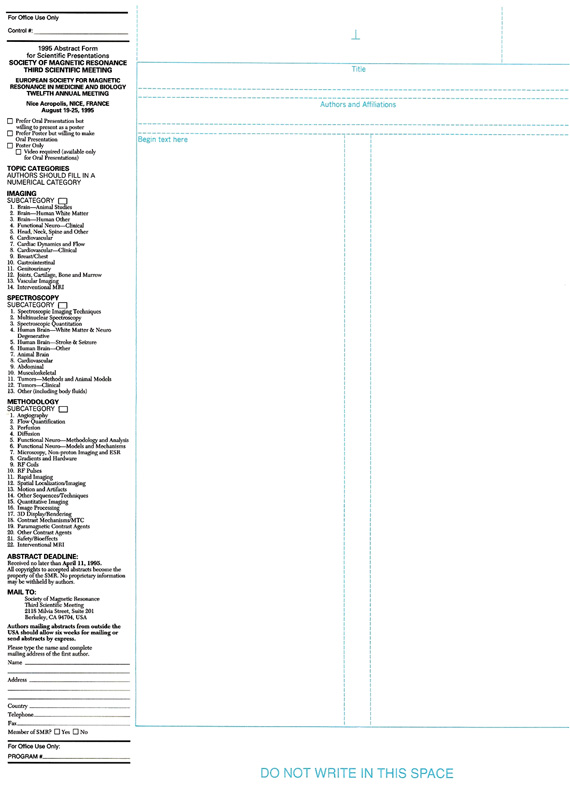 Figure: ISMRM abstract form from the 1995 Annual Meeting (Nice, France).