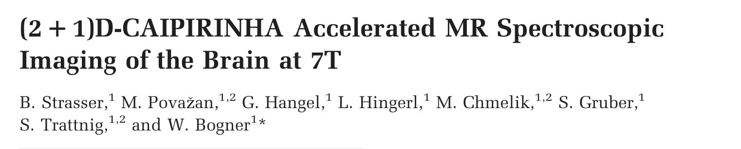 This week we gathered across multiple continents (as I feel we always do!) to discuss the ins and outs of spectroscopic imaging with Bernhard Strasser and Wolfgang Bogner, two authors of “(2 + 1)D-CAIPIRINHA accelerated MR spectroscopic imaging of the brain at 7T”, one of the MRM Editor’s Picks for August 2017. In this paper, Bernhard and his colleagues propose a new method of acceleration for magnetic resonance spectroscopic imaging (MRSI) that combines 2D CAIPIRINHA with simultaneous multi-slice (SMS) to accelerate imaging in all three spatial dimensions.
