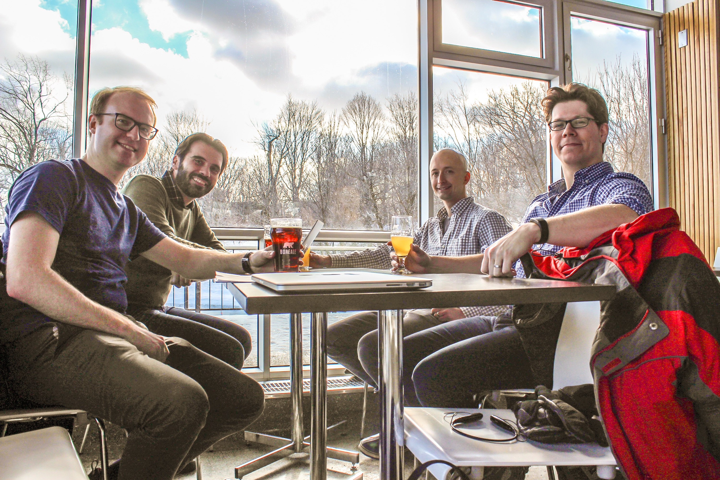 Highlights team members, Benjamin and Nikola, chat with Jamie and Gabriel over a cold drink at Beaver Lake in Montreal, Canada.