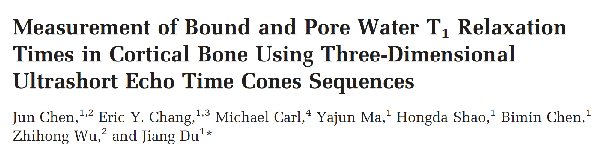 I recently had the pleasure of chatting with Drs. Jun Chen and Jiang Du about their recent MRM manuscript entitled “Measurement of Bound and Pore Water T1 Relaxation Times in Cortical Bone Using Three-Dimensional Ultrashort Echo Time Cones Sequences”. We came together over three distinct time zones, stretching from Peking, China to San Diego, California and finally to me right outside of Washington, D.C, where thanks to a strong internet connection we discussed the ups and downs of ultrashort echo time (UTE) imaging. UTE is a method for direct imaging of tissues that have short transverse relaxation times by shortening the delay between excitation and readout. For example, in this paper, the echo time for UTE imaging was only 8 μs, compared to a traditional gradient echo readout, that would have a minimum of 2-5 ms, depending on the sequence. Jun and Jiang, along with their colleagues in the U.S. and China, have been working to apply UTE sequences to explore the T1 properties of cortical bone and give clinically relevant information on components of the cortical bone structures not easily investigated with conventional radiological techniques.