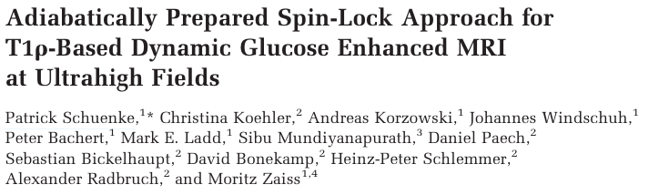 This week we ventured across continents to speak with Drs. Patrick Schünke and Moritz Zaiss, two primary authors of a recent paper from the German Cancer Research Center (DKFZ) in Heidelberg, Germany titled: “Adiabatically Prepared Spin-Lock Approach for T1ρ-Based Dynamic Glucose Enhanced MRI at Ultrahigh Fields.” In this paper, the authors developed an NMR method for imaging glucose using an ultrahigh field MR scanner and a spin-lock approach to gain sensitivity to chemical exchange. At ultrahigh field strengths, distinct artifacts appear predominantly resulting from RF field inhomogeneities. Thus, adiabatic pulses were implemented to enable the application of spin-lock MRI at fields such as 7T. This adiabatic spin-lock approach is explained, its feasibility for application in vivo at 7T is verified, the technique’s sensitivity to glucose is investigated, and a first proof of concept of spin-lock based glucose imaging for the detection of cancer in humans is presented.
