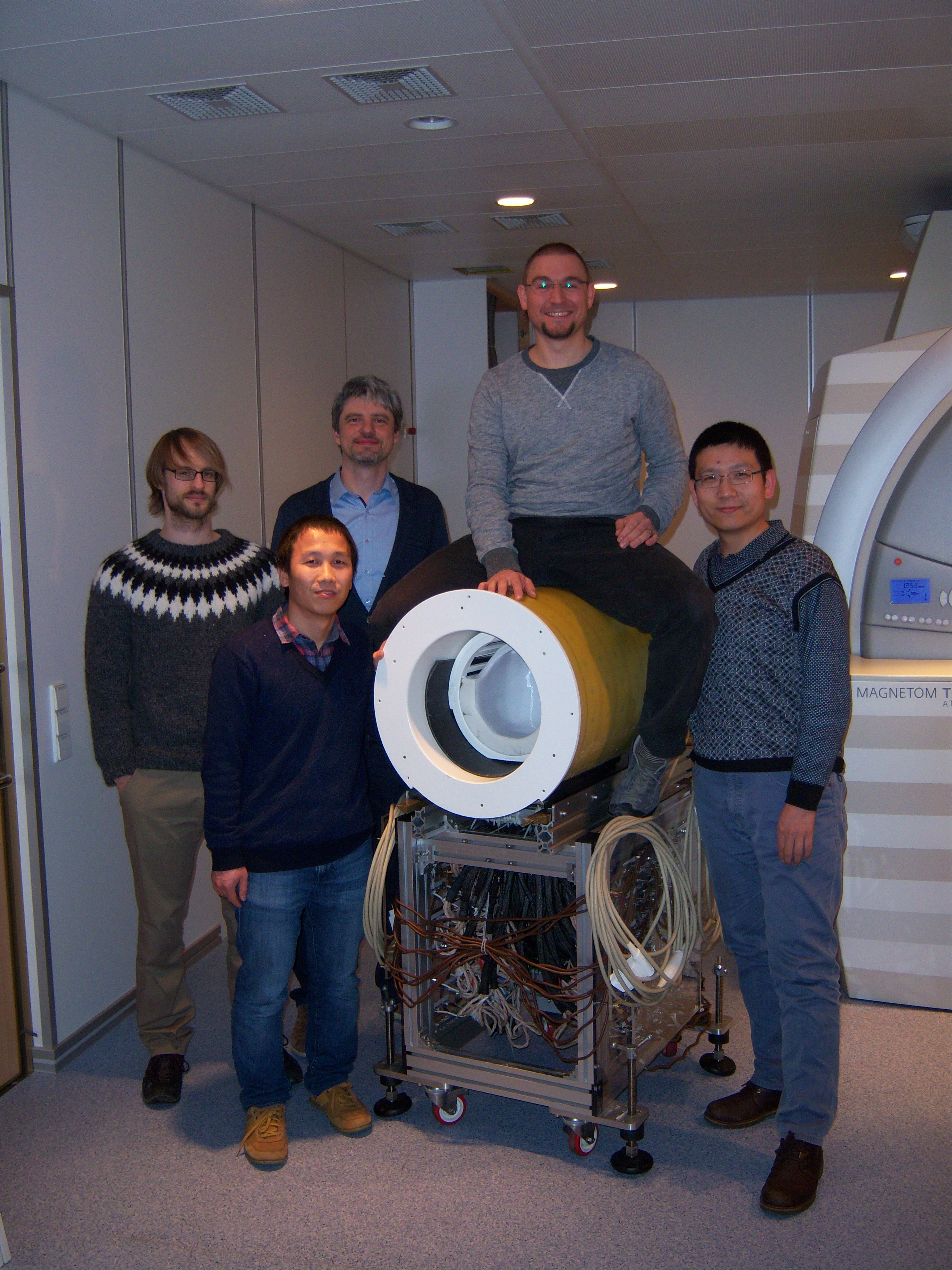 Stefan Kroboth, Huijun Yu, Maxim Zaitsev, Sebastian Littin and Feng Jia (from left to right) at their 3T research scanner, in Freiburg