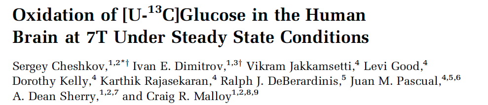 Sergey: In this paper, we wanted to propose a noninvasive method to study brain metabolism and glucose oxidation in the living human brain, by utilizing Carbon-13 NMR spectroscopy. Current tools used to study brain metabolism have real limitations. For instance, positron emission tomography (PET) scans are more or less the standard for glucose metabolism, but have limitations such as ionizing radiation which make them unsuitable for many types of exams. More importantly, PET can’t follow the fate of glucose through glycolysis or oxidation in the TCA cycle. There is lots of important previous work infusing carbon-13 labeled molecules into humans with detection by NMR, but these kinetic studies require long infusion periods in the magnet, which is not easily practical for real patients. We wanted to investigate the information that we can get from a relatively simple, steady-state exam. We have a terrific 7 T magnet here, and we know very well that high field will give us better sensitivity and better spectral dispersion, so we decided to use that for this project.