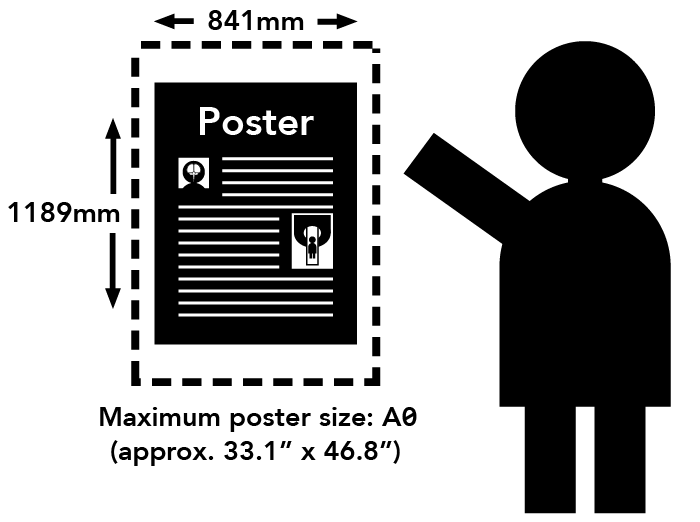 Each presenter is assigned a rectangular A0-sized space with maximum dimensions of 841mm wide by 1189mm tall (33 1/8" by 46 13/16"). Posters exceeding these measurements (i.e., extending into areas reserved for other posters) may be removed.