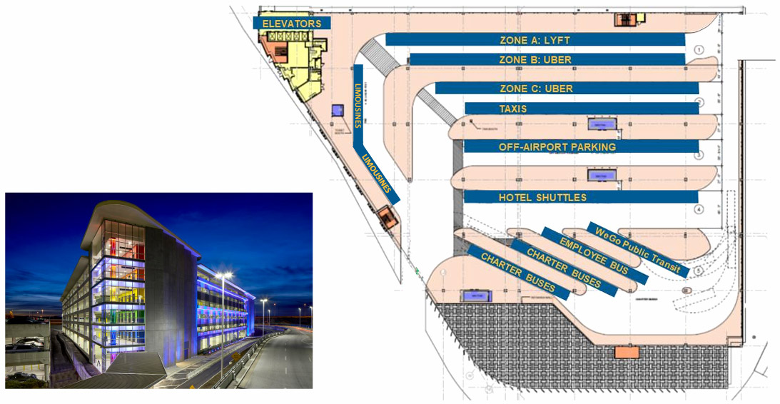 Uber and Lyft are available through their mobile apps. Pick-ups are located at the Ground Transportation Center, Level 1 of Terminal Garage 2. See image above for their specific areas.